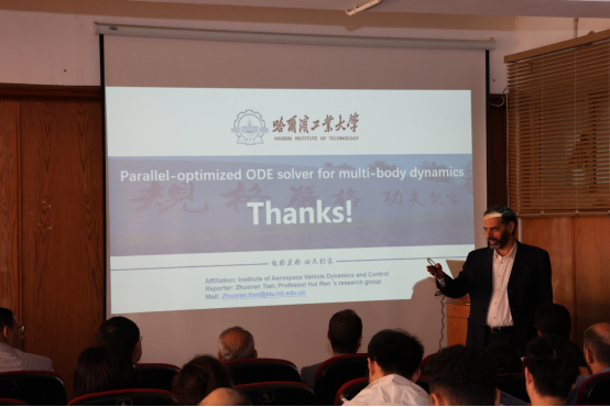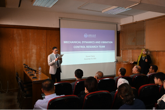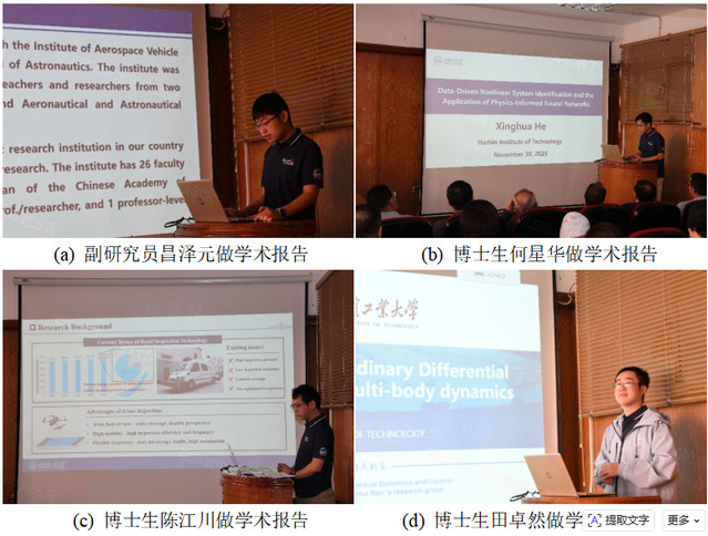 在学术报告环节,ylzzcom永利总站昌泽元副研究员作了题为“Mechanical Dynamics and Vibration Control Research Team”的开场报告,介绍了飞行器动力学与控制研究所的主要研究方向及相关成果、合作前景与框架。ylzzcom永利总站博士生何星华、田卓然、交通科学与工程学院博士生陈江川分别围绕“Data-driven nonlinear system identification and application of physical information neural networks”“Parallel-optimized Ordinary Differential Equation solver for multi-body dynamics”“Unmanned aerial vehicle road disease detection based on deep learning”前沿课题进行报告。系列报告内容紧扣工程技术挑战与学术创新,引发了埃方师生的高度关注与深入讨论,为后续联合科研奠定基础。